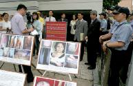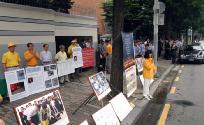 接下来,学员们又到2公里外的中国领事馆前举行活动。领事馆位于市中心,是办理有关中国领事事务的诸多中国人必经之地。因此这里也就成了学员们经常举行讲真象活动的场所。