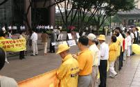 活动开始前,各地学员们三三两两提前来到现场,摆好真象图板并拉起呼吁制裁江泽民的横幅之后,就秩序井然的发正念。在7月17日举行的大型彩车游行圆满结束之后,学员们感觉得到今天被派到现场的警察们态度都变得很温和。学员与警察们合作溶洽,警方也为此次活动的圆满举行给予了最大的照顾。