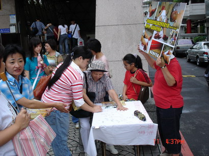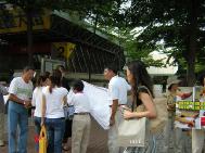 一位女士带着一群刚上完音乐课的小女孩经过,在了解我们的诉求后,主动在布条上签名,并说之前已经了解了法轮功受迫害的真象,她很认同我们的征签活动。她带的小朋友们也在这位女士的同意下,纷纷签下了她们的名字,并问了很多问题。如:为什么要杀人?好残忍哦!我们向小朋友解释法轮功在中国遭受镇压的事,并告诉她们这些是由中国江氏集团发起的恐怖行为,只要有更多人站出来,并把这些事情曝光,他们就不敢再做了。