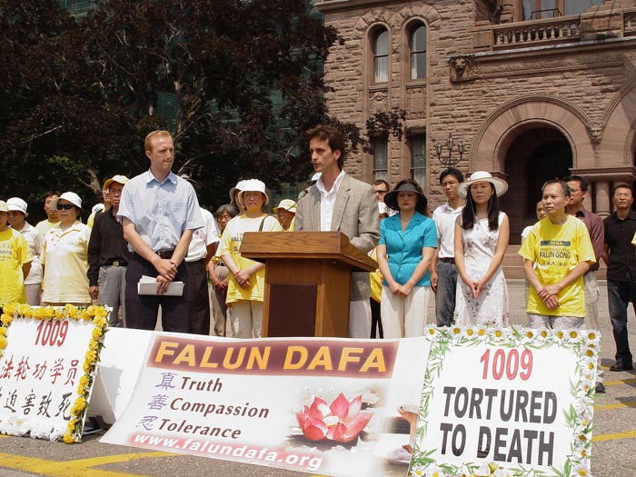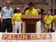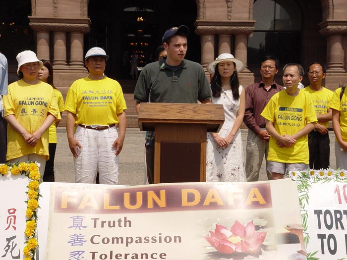 多伦多大学学生会的副主席迪兰-瑞今天也特意前来参加了今天的活动并在新闻发表会上发言。迪兰表示他代表多伦多大学学生会及其所代表的3万多名在校学生表达对法轮功的支持,他们今后将一如既往的声援法轮功的和平抗争,共同帮助停止这场镇压。多伦多大学学生会在过去五年中三次通过动议案支持法轮功,谴责中国江氏集团对法轮功的迫害,并多次致信联合国,加拿大政府,要求他们站出来公开谴责这场残酷的迫害,帮助来一起制止迫害。