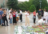 2004年7月24日,澳洲墨尔本部分法轮功学员来到地处墨市市中心的维多利亚州图书馆,在馆前的大草坪处,学员们举行了酷刑展示——向人们揭露了中国江氏政治流氓集团五年来残酷迫害法轮功学员的邪恶罪行,并介绍了中国的法轮功学员所遭受的种种酷刑;同时,学员们还连续進行了功法表演——向行人展示这传世十余载受到60余国家人们欢迎的法轮大法的五套功法;学员们还在草坪左前方设置了叠纸莲展桌,展桌前还簇拥着排队来签名支持的人们。