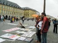 2004年7月24日德国南部、奥地利部分弟子在德国巴伐利亚州首府慕尼黑的欧地安斯广场举办了模拟展示中国警察对法轮功学员施展酷刑的表演。