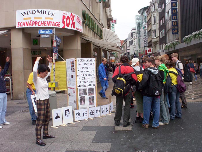 【明慧网2004年7月26日】在江氏集团迫害法轮功届满五周年之际,来自德国北莱茵西法伦洲(Nordrhein-Westfalen)的法轮功学员在多特蒙德市(Dortmund)设立了两个真象展位。