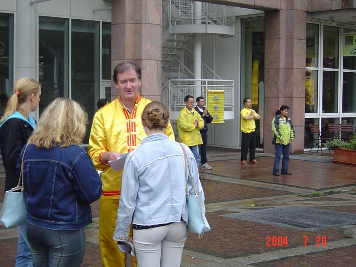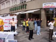 二零零四年七月二十日上午,学员们来到多特蒙德市政府广场前设立了法轮功真象展位,向来往的世人展示法轮大法祥和美好的境界以及大法在中国受迫害的现状。