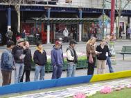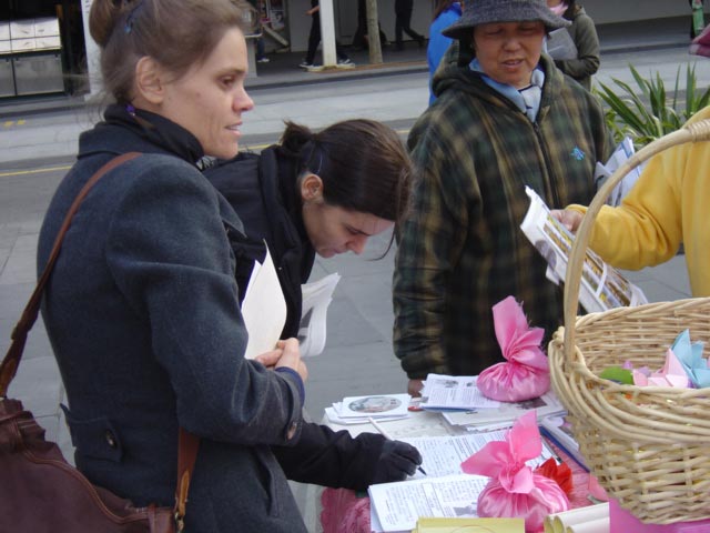 很多行人在了解了这一切后表示了他们对迫害的厌恶和憎恨,并问:“我能为你们做些什么?”学员们让他们跟更多的人讲这场迫害及其邪恶本质,呼吁世上有良知的人们都来反对这场迫害,目地是让这场迫害早日停止,还清白于信守“真善忍”的法轮功学员,让这一洪扬世界的大法重返中华大地。