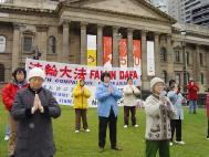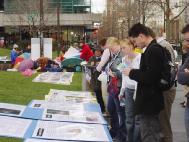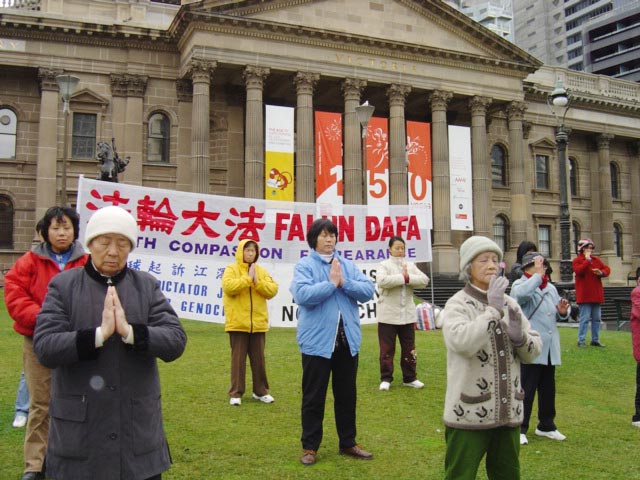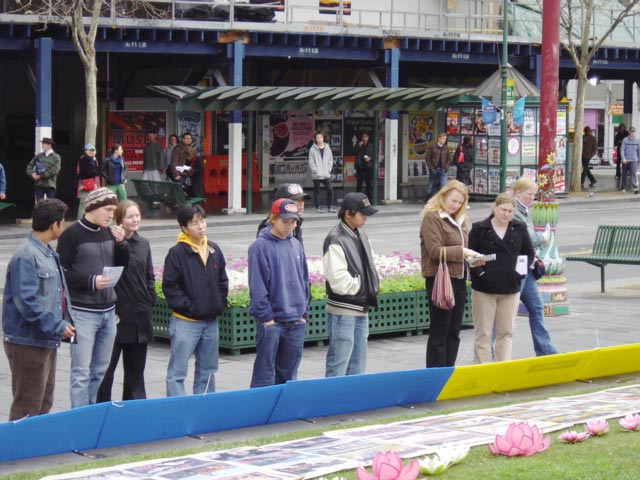 【明慧网2004年7月26日】2004年7月24日,澳洲墨尔本部分法轮功学员来到地处墨市市中心的维多利亚州图书馆,在馆前的大草坪处,学员们举行了展示——向人们揭露了中国江氏政治流氓集团五年来残酷法轮功学员的邪恶罪行,并介绍了中国的法轮功学员所遭受的种种酷刑;同时,学员们还连续進行了功法表演——向行人展示这传世十余载受到60余国家人们欢迎的法轮大法的五套功法;学员们还在草坪左前方设置了叠纸莲展桌,展桌前还簇拥着排队来签名支持的人们。