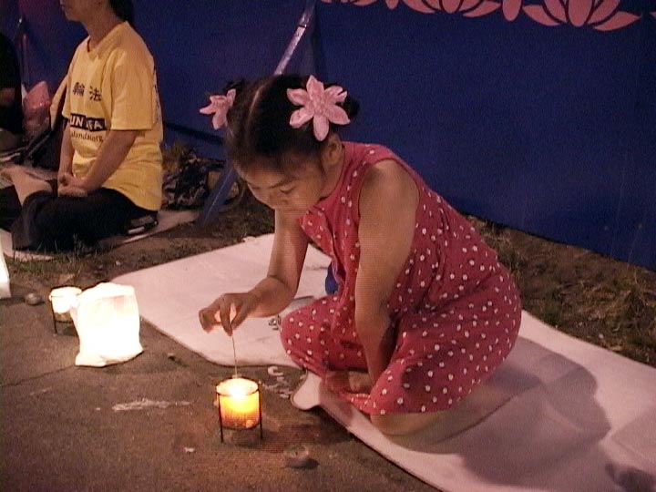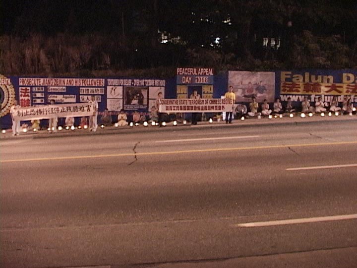 “在这五年之中,在历史的长河中,是一眨眼的时间,可是在我们却是度日如年。在我所认识的同修里,有许许多多至今被关押在劳教所,被关押在监狱里头,有的被残酷的迫害致死。印象最深刻的有,我们的辅导站的站长袁江,他也是我刚开始炼功时辅导我动作的一个朋友。年仅29岁,清华大学毕业生,是单位里的业务骨干,被抓了仅仅三个月,就被活活的折磨死。死了以后,把尸体抢走火化,不准曝光。另外我昨天刚知道,跟我一起到北京去上访的一个同修,小徐,她也离我而去了,还有很多,老谢,老杨,小万,还有很多很多,他们都在劳教所,监狱里受尽煎熬。想起这些,我心里十分难过。我们没有做错什么,我们更没有犯罪,而是江泽民他们完全违背了中国的宪法,违背了中国的法律,将我们修真善忍的人置于死地,天理不容。我今天在这里烛光守夜,我悼念离我们而去的朋友。我希望在国内的朋友,仍然坚贞不屈,坚持真理。我也呼吁所有善良的正义的人们,伸出你们的援助之手,制止中国江泽民流氓集团的血腥镇压。”