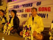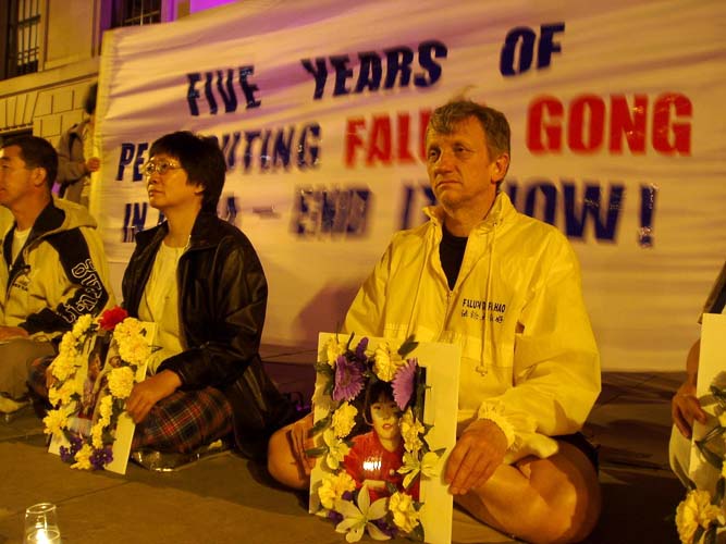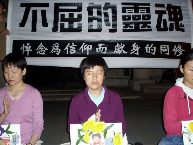 学员们在中使馆外打出了中英文的大横幅,上面分别写有“不屈的灵魂:悼念为信仰而献身的同修”和“立即停止对法轮功五年的迫害”。学员们点燃了一枝枝蜡烛,在路边摆成长长的一行。烛光闪烁,遥寄对为坚持信仰而献身的同修的哀思;整点发正念,清除环宇中邪恶的败物。