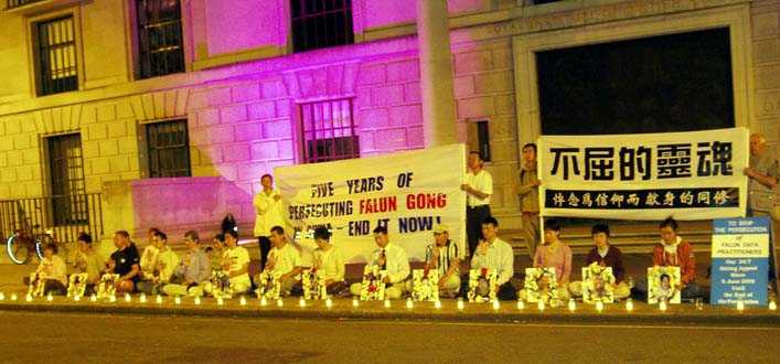 【明慧网2004年7月26日】2004年7月23日晚,英国法轮功学员在中国驻伦敦大使馆、中国驻曼彻斯特和爱丁堡领事馆外举行烛光夜悼,纪念在中国大陆被迫害致死的法轮功学员,同时呼吁善良的人们一起来停止这场迫害。