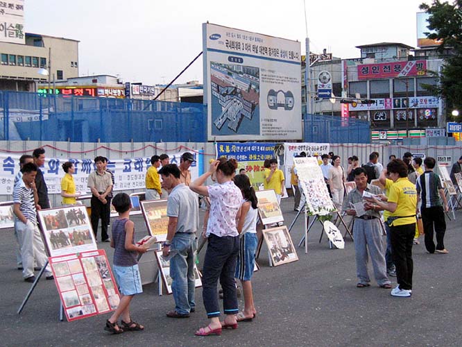 【明慧网2004年7月26日】2004年7月24日,韩国大田及忠青的法轮功学员们在大田火车站广场前举行纪念活动,追念自1999年7月20日以来因江氏集团的非法迫害而牺牲的众多法轮功学员。同时也向广大市民揭露这些至今仍在发生着的毫无人性的迫害法轮功的事实。