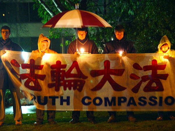 学员们手持蜡烛,静静的站在中领馆的对面,追悼五年来被迫害致死的同修。一支支蜡烛就象一颗颗真诚的心,呼唤着世人的良知。狂风一次次将蜡烛吹灭,又一次次被重新点燃,就象法轮功学员那坚韧不屈的精神始终在黑夜中闪光,同时也象征着法轮功学员在用心呵护着世人那一点未泯的良知,不让它熄灭。