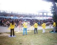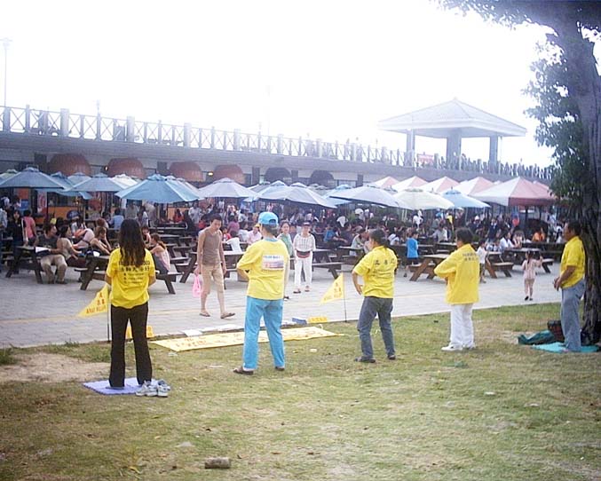 几位淡水区的法轮功学员所组成的炼功洪法小组,固定于每周六及周日下午在渔人码头桥下咖啡座前的草坪上炼功洪法。