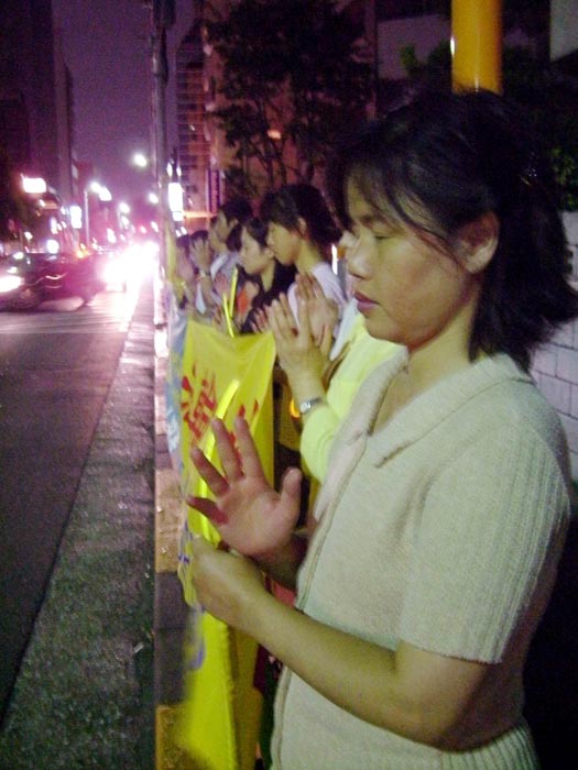 76岁的旅日华人鲁老先生得知当天傍晚开始的这次活动,很早就赶到现场,表示要支持法轮功学员的正义行动,大力向社会揭露江氏灭绝人性的残暴。