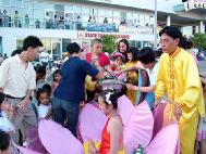 莲花车里坐着的大法小弟子颇为引人瞩目。 她身着中国古代传统儿童服装,盘腿打坐, 祥和宁静、端庄可爱。我们的队伍出场不久,小弟子的莲花车就被蜂拥而至的小观众和家长团团围住, 前来索取小莲花。那热闹的一景成为游行中一大花絮。