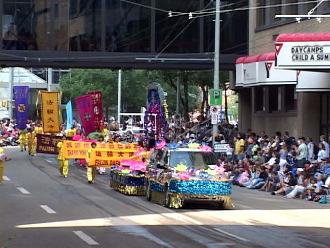 【明慧网2004年7月29日】一年一度的淘金节(Klondike Day)游行是加拿大阿尔伯塔省省会埃德蒙顿市最盛大的游行。2004年又恰逢埃德蒙顿建市100周年,所以今年7月22日举行的淘金节游行更是盛况空前。总共有110多个团体参加了游行,大约20万人在现场观看游行盛况,数以百万计的人通过电视观看游行。