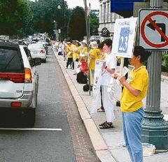 超过三千名法轮功学员23日在首府华盛顿的康乃狄克大道身着黄衫、手持“真善忍”及反迫害标语、图片,排成长达三哩的“勇气长城”,终点是中国驻美使馆前的天安门纪念公园。康乃狄克大道是首府出城要道之一,从市中心到杜邦圆环,一路吸引过往民众及驾驶人的注意。