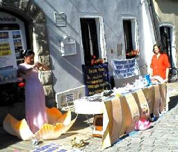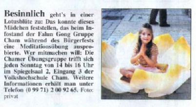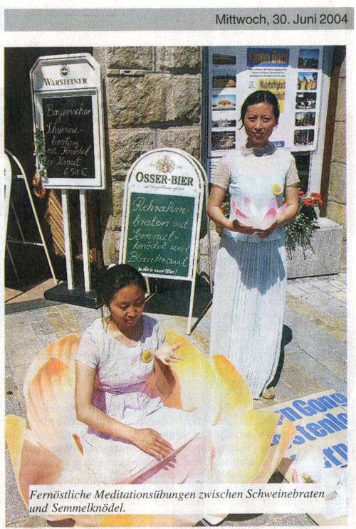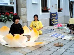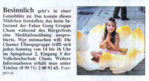 【明慧网2004年7月3日】2004年6月26,27日,德国巴伐利亚州的小城卡姆市迎来组办规模最大的市民节。本市的法轮功学员也在该市民节中申请了信息展台和功法及传统舞蹈表演。热闹的市民节因为法轮功的到来而增添了一份祥和之意境。