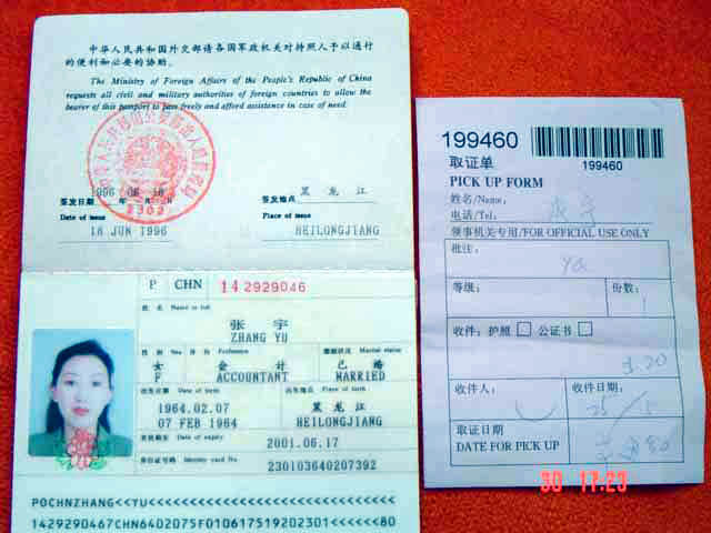 我的中国护照有效期是2001年6月17日。我于2001年5月25日到中国驻悉尼领事馆办理护照延期,我把护照、填写好的表格和照片递進窗口,里面的工作人员看看护照,写给我一张取证单,号码是199460(见照片),取证日前一栏写着“等通知”,我就问他什么时候取护照,他说:“你回去等通知。”我问:“为什么?”他不回答我。于是我想办法找到值班领导,一位姓具的领事,我把取证单给他,说:“请帮我问一问为什么我延期护照要回去等通知?”他说:“你缺手续。”我解释说我的手续是全的,于是他给里面打了一个电话,之后,他指指门口,很不友善地说:“你特殊,你是外面的。”之后就不理我了。他意思说我是属于为了停止镇压而静坐在中国领馆外面的法轮功学员。
