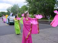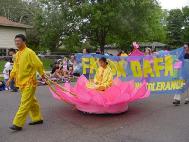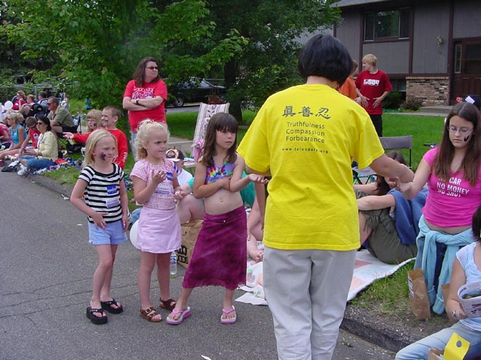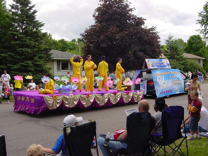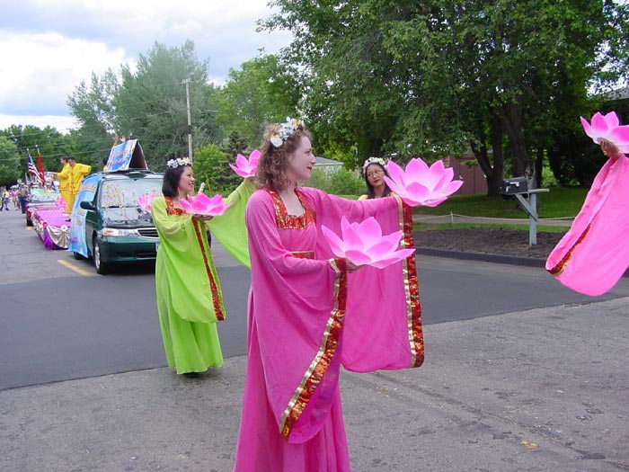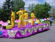 【明慧网2004年7月3日】2004年6月26日,明尼苏达州法轮功学员应邀参加了明尼苏达州BLAIN市每年一度的独立节周游行活动。去年明州学员也参加了该游行,给观众留下了非常美好的印象,受到了观众和游行组织委员会的好评。这次法轮功学员们再一次的给BLAIN市的人们带来了祥和,美好而又令人们内心兴奋的表演。在数百个彩车中,法轮功学员的彩车脱颖而出,连续二年获奖。