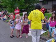 今年的游行中,更多的人主动要法轮功真象材料,特别是可爱的孩子们更是抢着要传单。学员们从内心为这些人们祝福。有些观众对法轮功的彩车和学员的功法表演表示惊讶和钦佩。有人说:“非常美,很特别,其它彩车的音乐非常的吵闹,可你们是如此平静和美好……”