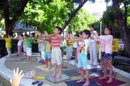 一位太太看见这么多小朋友炼功,也当场学炼起来了