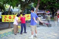 7月11日是周日的下午,小弟子们到台北明慧学校上课,一开始先学法,而后由同修阿姨带小弟子上连环图画课。同修阿姨请一位小朋友讲自己修炼的故事,这位小弟子讲的是跟妈妈到香港向中国人讲清真象的故事,而后小弟子各自专心的画自己的修炼故事,有的画在另外空间看见的事物,如法轮、飞天、龙、莲花、发正念除恶等。最后一节课全体小弟子们前往中正纪念堂炼功、洪法讲真象。陆陆续续都有路人站在跟前,看小弟子炼功。炼完功后,小弟子们走入人群中讲清真象发传单,告诉路人法轮大法好。有家长反映小弟子回家后了解讲真象的重要,要求以后要参加洪法讲真象的活动。
