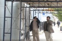 ![]() 2001年9月7日打人者郑积明(右)在马路上向方霖冲来,翁玉俊(左,车内)推车门冲出。 | ![]() 2002在8月27日郑积明(右) 和Kwok, Sing-chok(左)在進法庭时遮脸回避拍照。 |