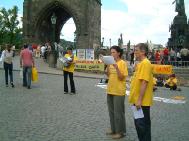 在2004年6月26日星期六国际反酷刑日之际,捷克和英国的法轮功学员聚集在捷克首都布拉格市著名的查尔斯桥畔的克瑞佐尼克广场,纪念残酷迫害中的受难者。