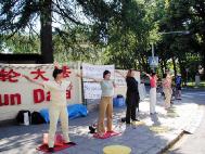 一位年轻的德国小伙子和一位中国姑娘刚从中领馆办完事出来,他们问我们法轮功到底是怎么一回事,小伙子将手里拿的一本诬蔑法轮功的小册子给我们看,说是领馆的工作人员给他的。一位德国学员跟他谈了很长时间,最后明白真象的他把小册子给我们留下了。那位姑娘则问我们自焚是怎么回事,学员把自焚中的疑点一一讲给她听,她说,原来是这么回事,刚开始在中国看电视时还真吓我一跳。学员并送给她有关的光碟,她很高兴的收下了。