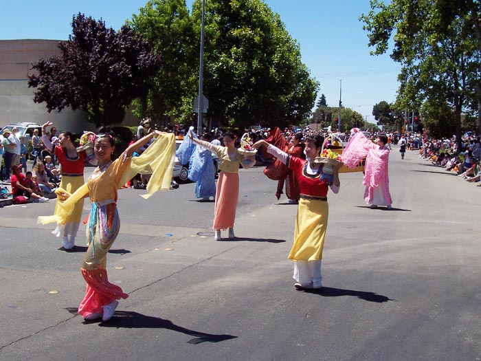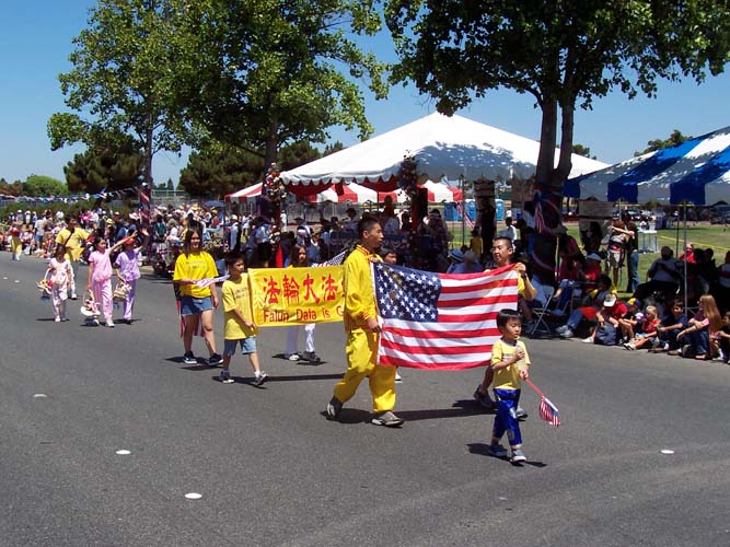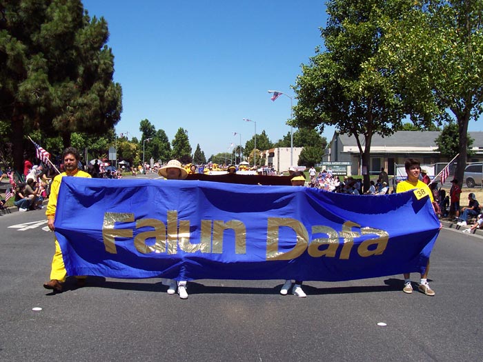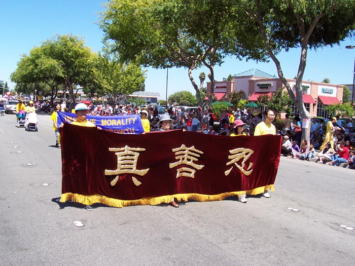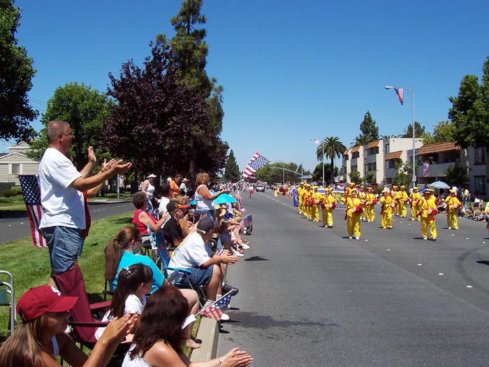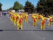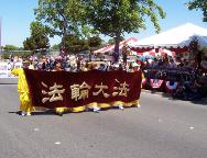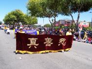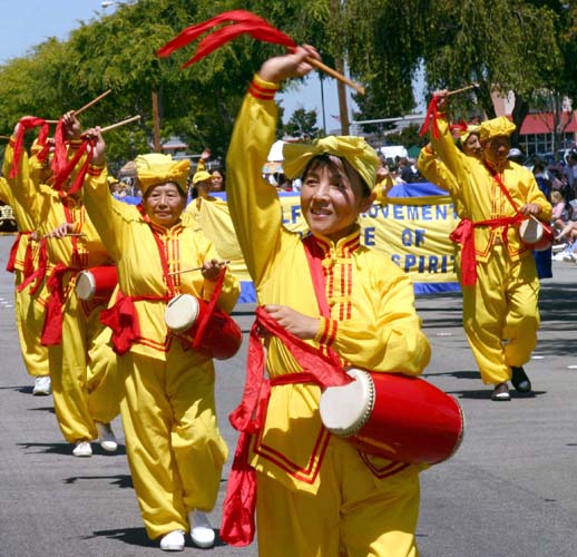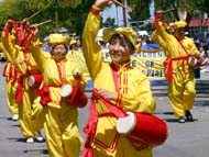 法轮功的队伍首先是由中、西方学员打出的“法轮大法”和“真善忍”横幅。雄壮、喜庆的腰鼓队紧随其后,鼓声震邪。“法轮大法好”的歌声、绚丽多彩的服装和优美的舞姿,不断获得市民们的掌声。有的人对法轮功的队伍竖起了大拇指。有的人说,太好了、太美了。