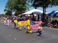 当法轮功学员的队伍经过主席台时,主持人向观众介绍说,法轮功是按照“真善忍”修炼的功法,在世界上60多个国家里有一亿多人修炼。他们还参加了红木城等城市的游行活动。