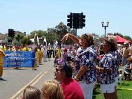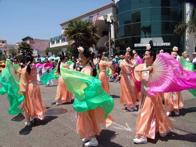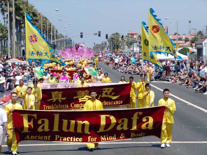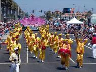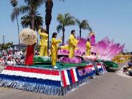 【明慧网2004年7月5日】2004年7月4日美国国庆,南加州美丽的海滨城市杭庭顿滩 (Huntington Beach)举办第100届国庆游行。洛杉矶法轮功学员,以及部分来自圣地牙哥和拉斯维加斯的学员,首次参加了这一美国密西西比河以西规模最大的国庆游行。法轮功学员表演的腰鼓、仙女舞,装饰着巨大莲花的花车,以及花车上的功法表演,受到观众的热烈欢迎,给沿途30万欢腾的民众带来真善忍的美好祝福。