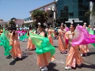 法轮功学员的游行队伍包括标语队、舞蹈队、腰鼓队、花车等部分,是规模较大的游行队伍之一,也是参加游行的唯一一支华人队伍。身着唐装翩翩起舞的仙女、腰鼓队亮丽的黄色服装和整齐划一的动作、花车上盛开的莲花,以及学员们打出的红底金字中英文大横幅“法轮大法”、“真善忍”,在丽日蓝天之下份外醒目。