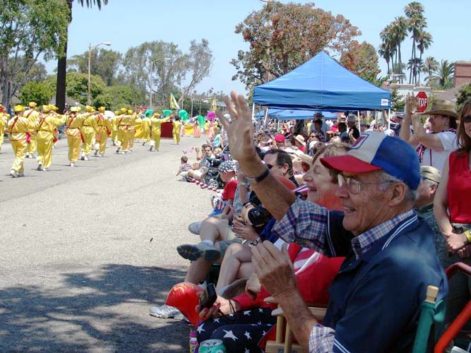 美国人民对法轮功学员与他们共同欢庆节日极为热情,不断为法轮功学员的精彩表演报以热烈的鼓掌欢呼。观众中,有人高喊着刚刚学会的“法轮大法”;有人挥舞着国旗,随着腰鼓队的鼓点手舞足蹈;有人模仿着花车上学员的功法表演,做起了法轮功的动作。人群中不断有人喊着:“太美了!”“真漂亮啊!”一位白人女士兴奋的对着法轮功队伍用中文大喊:“你好!你好!”两位男士乘队伍停下来的机会,站在“法轮大法好”的横幅前留影,并对着横幅鞠躬、作揖;一位维持秩序的警察被优美的功法吸引,找学员询问在哪里可以学功。