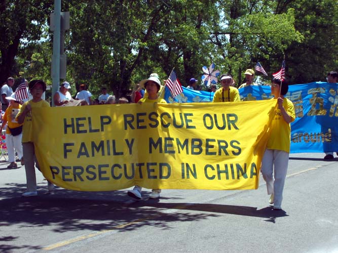 法轮功的队伍最前面是“法轮大法好”和“真善忍”横幅,接着是七仙女舞蹈队,后面是大幅法轮图形和功法示范方阵,接下来是请帮助营救在中国受迫害的亲人标语,随后有小弟子的推车和法轮大法洪扬五洲四海横幅。30多人组成的队伍,井井有条。让所有的观众耳目一新,纷纷赞许。