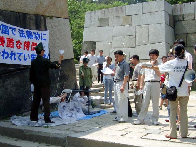 许多年轻的韩国游客在观看演示场景时,都是边听学员介绍,边用手绢拭着眼泪的。当学员们告诉他(她)们说,他(她)们所看到的,还不及实际的百分之一时,这些游客都对目前在中国遭受着野蛮迫害的法轮功学员的处境表示深切的担忧。