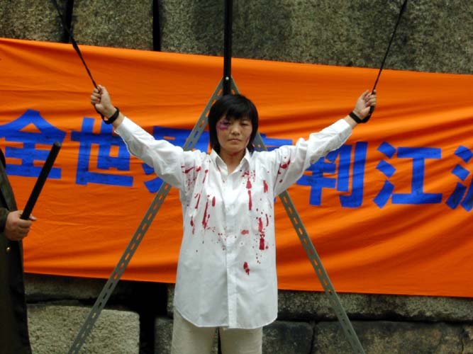 一大早学员们摆开了演示道具后,扮演受酷刑折磨的中国大陆学员与扮演实施酷刑的警察的学员随即進入了角色。