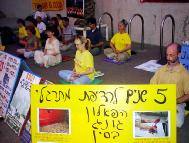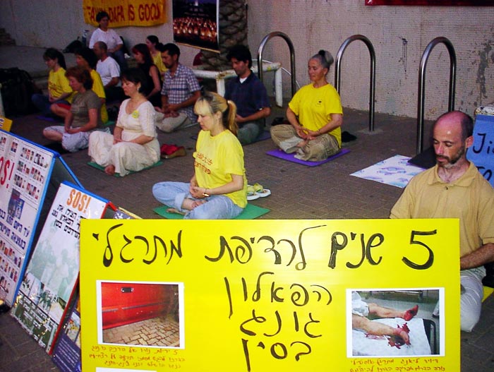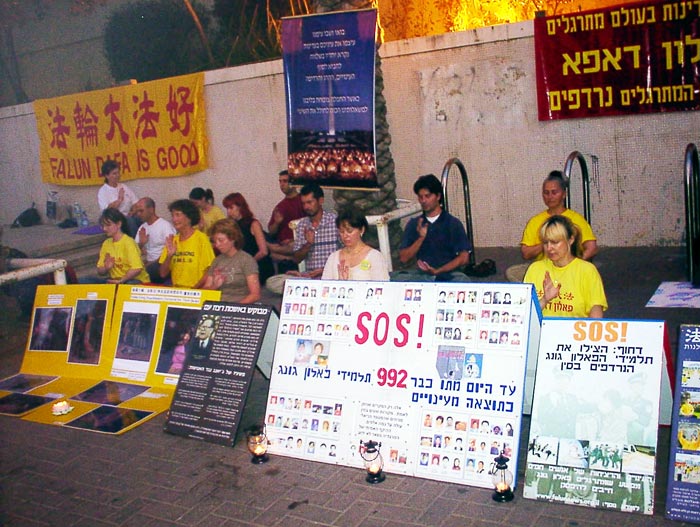 【明慧网2004年7月8日】星期一晚,以色列的法轮功学员在中国驻以色列特拉维夫(Tel Aviv)大使馆外,抗议江泽民集团将对法轮功学员的迫害延伸到海外。学员们手举横幅,并展示发生在中国的酷刑迫害图片。