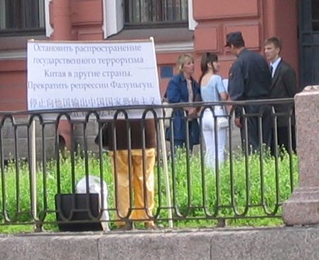 值得一提的是,抗议开始后,俄方警察在中领馆的压力下,强制抗议的学员把横幅转向背对中领馆;后来,当中领馆得寸進尺,進一步要求把横幅扔到地上时,得知了真象的警察队长亲自走过来,帮助学员把横幅转向,使之重新面对中领馆。
