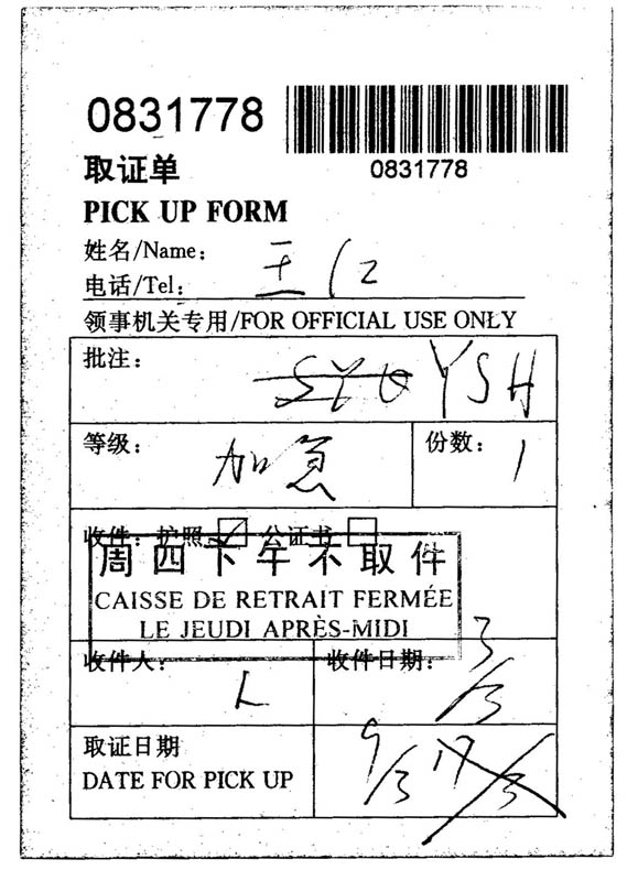 【明慧网2004年7月9日】我叫王红,现住法国巴黎,我的中华人民共和国护照于2004年3月3日到期。当日下午两点半,我去中国驻法国大使馆领事部办理护照更换。领事部的一位在“护照(1)”窗口负责办理的女士收下了我的申请表、两张照片、护照原件、护照及法国长期居留的复印件,告诉我3月17日取新护照,我说我马上就要出国,希望在最快的时间拿到新护照,于是在我的要求下她给我开了加急的收据,让我于3月9日来取新护照。(见收据)