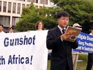 最近,美国国会国际关系委员会发起一项针对法轮功学员在美国受到中使领馆人员骚扰,非法干预法轮功在美活动自由的议案。南非枪击案已经引起了国际反应,多名澳大利亚议员,英国、美国、加拿大等国人权团体对此事件表示关注。一周前在华府白宫由20多家团体和个人举行的集会,谴责江氏小集团输出国家恐怖主义。