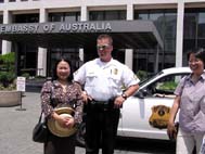 ![]() 法轮功学员在澳洲驻美大使馆前宣读给澳驻美大使的信 | ![]() 法轮功学员和使馆前警察合影 | ![]() 法轮功学员和澳大利亚驻美大使馆官员约翰-斯多克先生合影 |