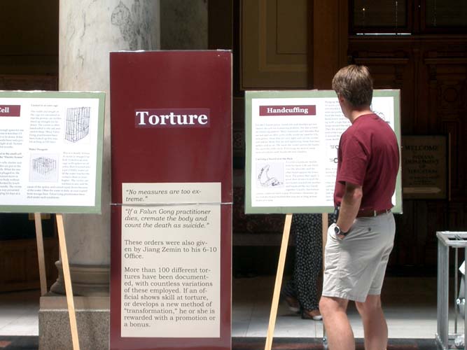大楼一位警卫人员,第一天学员们就向他讲真象,他说知道法轮功学员、美国公民李祥春在中国被关押一事,但不知道受迫害的法轮功学员人数会这么多,波及的面积会这么大,镇压会这么惨烈。以后的每一天,他都来和学员们友好的打招呼,不时的来到展板前看看,甚至告诉学员们哪天政府人物会来大楼,哪个工作日人数会多。他对学员表演的功法大加赞赏,无法理解江氏集团怎么能忍心镇压这样一群善良民众。