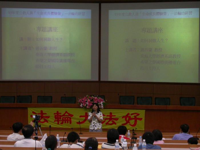 两日的研习课程虽不长,但内容精致多元,包含:多位国中小校长及法轮功学员们真挚感人的修炼心得分享、专家学者感性理性并重的专题演讲、诵读李洪志先生所著的《洪吟》及《论语》,观赏法轮功学员制作的高优质的诗词文字教学带,此外并教授法轮功五套功法,及教唱悦耳悠扬的法轮大法学员创作的歌曲。
