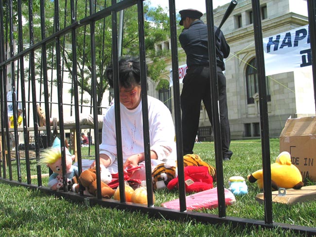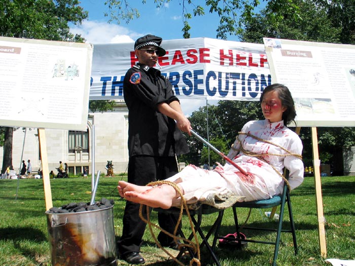 在酷刑展中扮演被折磨的法轮功学员的王女士曾经在国内被劳教一年。她说这里能演示出来的,同国内法轮功学员所遭受的折磨相比,只是冰山的一角。在一年的劳教中,她说光听到的法轮功学员被折磨时的惨叫声就足以让人受到极大的精神刺激了。她被迫做包筷子的奴工,条件非常的恶劣,半年不被允许洗澡,因没有足够的水洗漱,包筷子时手上经常都是泥,厕所里的水经常会溢出到放筷子的地方,虽然她出于卫生考虑拒绝将在这种条件下包的筷子出品,但警察还是强迫将所有的筷子出品,而且这些高级筷子主要都出售给大宾馆或出口到海外。在酷刑展中,王女士也演示了在狱中作奴工的场景。