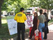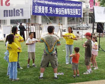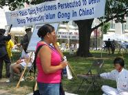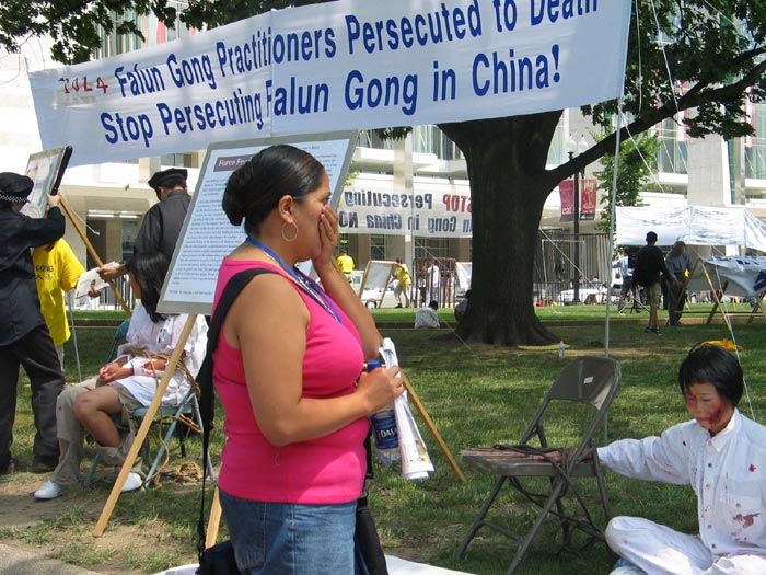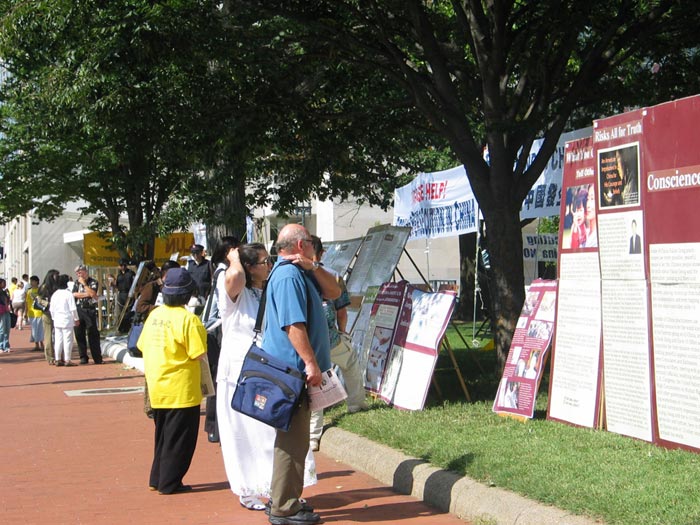 【明慧网2004年8月10日】2004年的美国少数族裔记者大会于8月4日至8日在华盛顿DC的华盛顿会议中心举行,有7000多名记者参加了这次大会。8月7日,法轮功学员在会场外的草坪上演示功法,以真人、图片等形式展示江氏集团在中国用以迫害法轮功的酷刑,引来很多过往的记者和路人驻足观看。