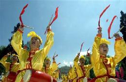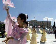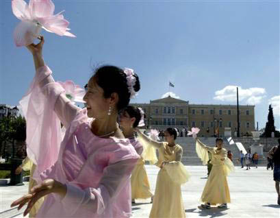 美联社8月11日报道,伴随着中国传统音乐,多数身着鲜艳服装的约百名法轮功学员和平的在雅典市中心举行了一次游行。这次游行的组织者将2008年北京奥运会与1936柏林奥运会進行了对比。