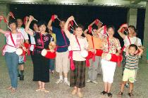 作者(左二)正在为洪法练习腰鼓表演