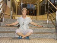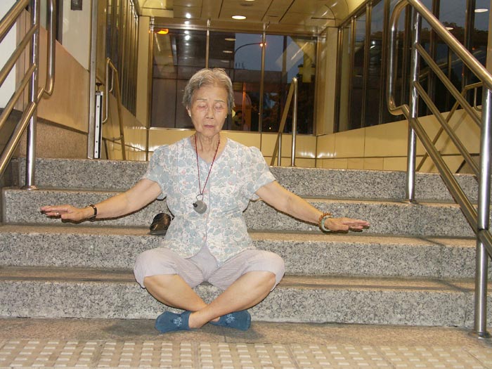 但过一会儿,再看到阿嬷时,令人惊奇的是,她竟坐在捷运站出口的阶梯上跟着我们学炼第五套静功,而专注祥和的神情,真令人感动。学员们看到此相片,也为阿嬷心中明了法轮大法的美好而为她高兴。