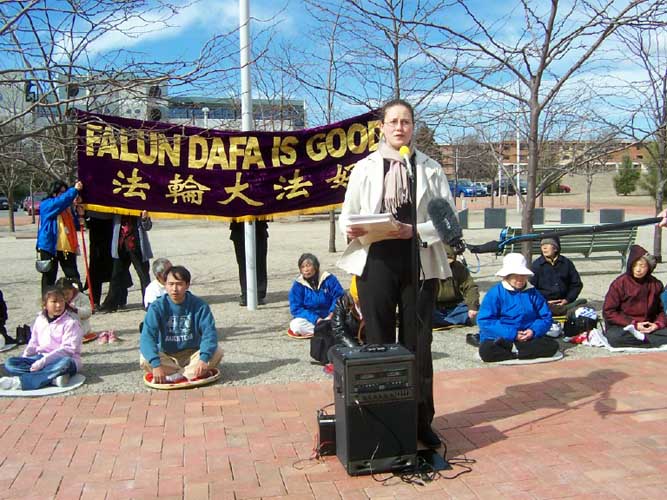 澳洲法轮大法佛学会成员Kay Rubacek宣读了递交唐纳的公开信。在感谢澳洲政府营救受迫害的法轮功学员及其家属的同时,学员希望澳洲政府继续维护正义,阻止中国对法轮功的国家恐怖主义输出海外。Kay在信中说:“澳大利亚的沉默就是在延长那些无辜的法轮功学员的痛苦。澳大利亚有责任公开谴责和帮助制止这场野蛮的镇压。”至今,仍有3位澳洲法轮功学员的家属在中国被非法劳教和判刑,Kay表示,“我们请求外长先生要求中国无条件的释放他们。” Kay谈到,如果中国在人权方面有所進步,社会更加稳定,才更有利于两国之间的贸易关系。
